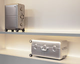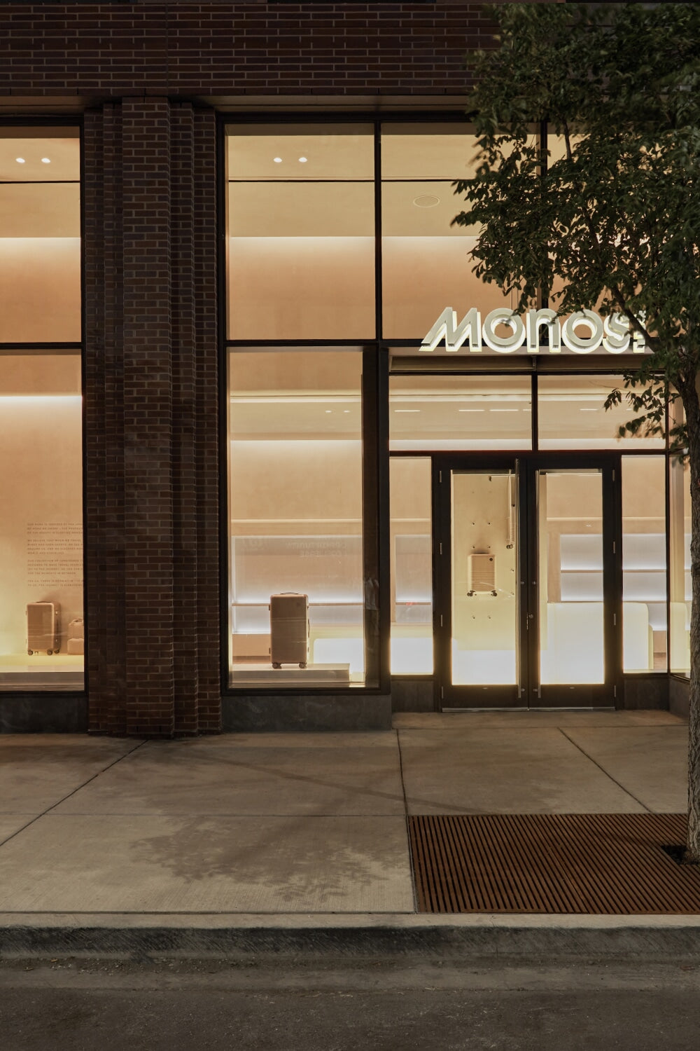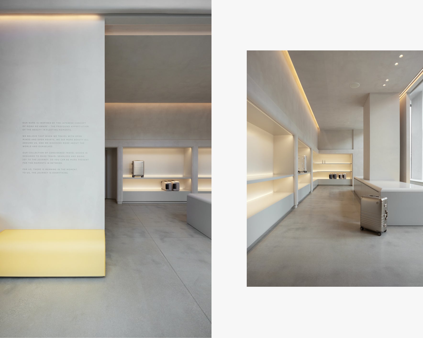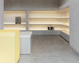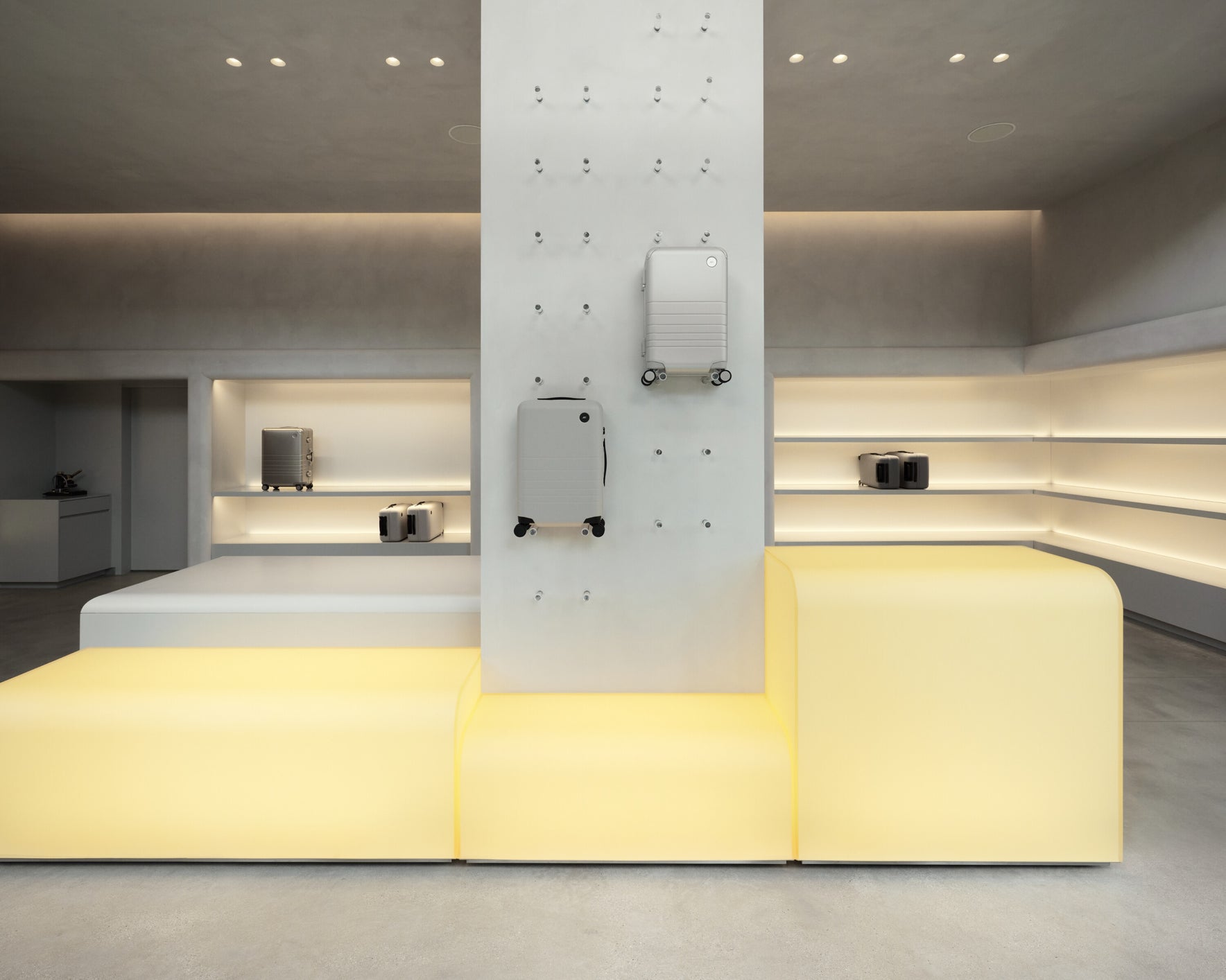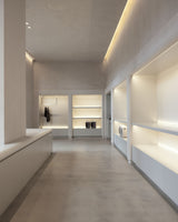 The store interior unfolds with a soaring, light-filled entry that gives way to soft curves, sculptural forms, and limewashed walls. At its heart, a luminous central counter draws the eye – a glowing architectural volume recalling the light boxes and vessels once used to display pharmaceutical remedies. Around it, built-in shelving forms quiet alcoves where products are presented with intention, while a central column doubles as a vertical display, letting luggage float like works of art.